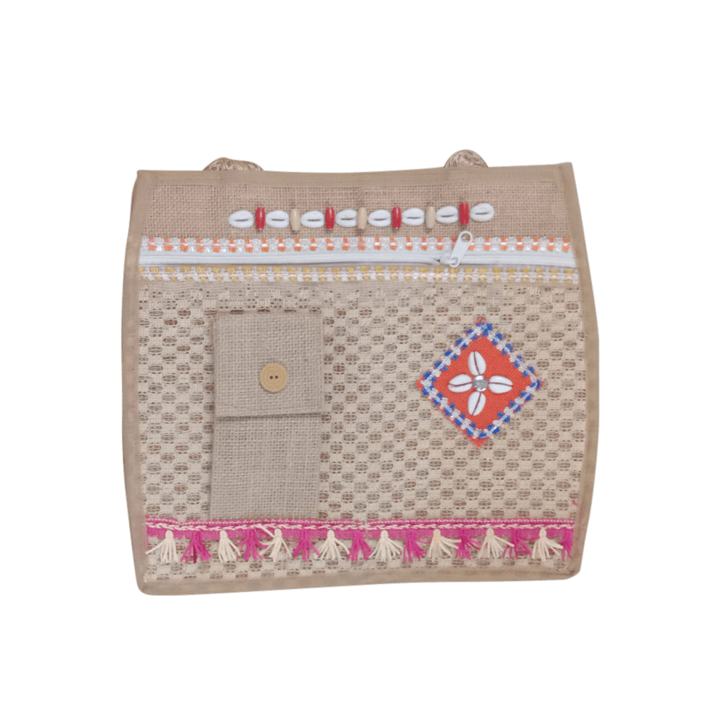 - Artisanal Patches: Includes a functional raw jute patch pocket and a decorative shell-embellished diamond patch.