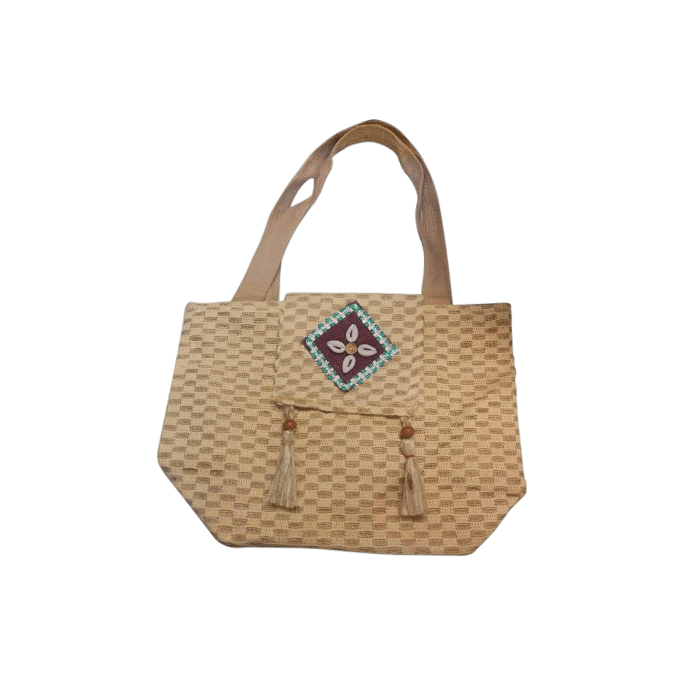 Material: Woven Natural Fiber/Jute Blend, Fabric Applique, Tassels