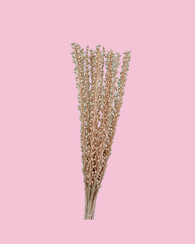 Add a touch of natural, rustic elegance to your space with this Golden Gargara Floral Bunch. This arrangement features slender, light brown stems crowned with delicate golden seed-like clusters, mimicking the beauty of a wheat field in autumn. The graceful design and warm color palette make it a versatile decorative piece that can stand on its own in a vase or be combined with other elements for a richer display. It’s perfect for creating a warm, earthy, and inviting atmosphere in any room.