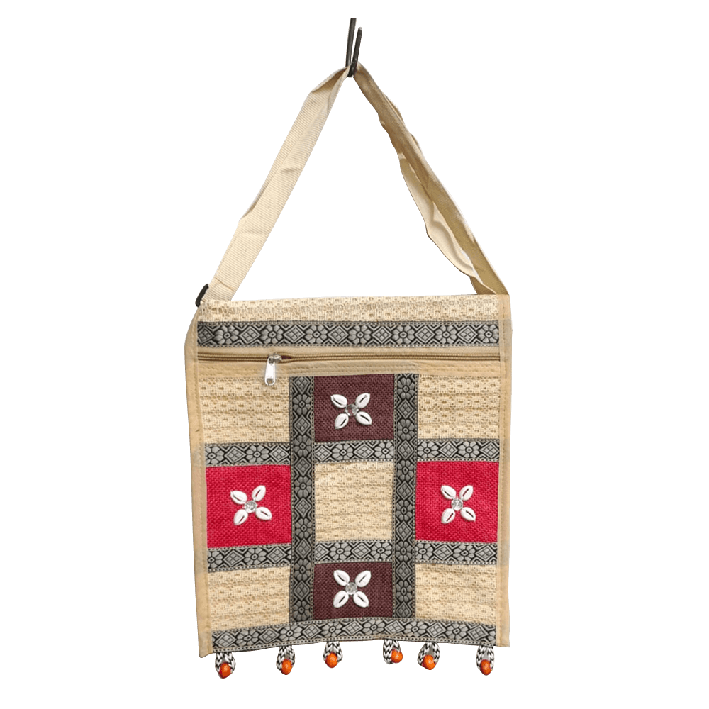 This handcrafted jute sling bag showcases a striking ethnic patchwork design featuring natural jute panels accented with vibrant fabric blocks and delicate shell embellishments. Finished with decorative wooden bead tassels at the base, it blends traditional artistry with practical everyday use. The bag includes a secure zip closure and an adjustable shoulder strap, making it ideal for comfortable crossbody wear. Lightweight, eco-friendly, and visually distinctive, it’s perfect for adding a boho-ethnic touch to your daily look.