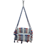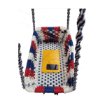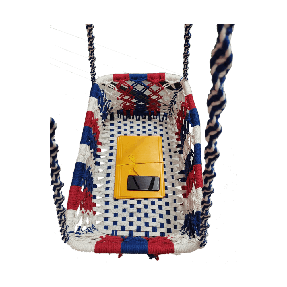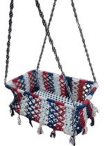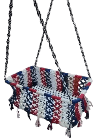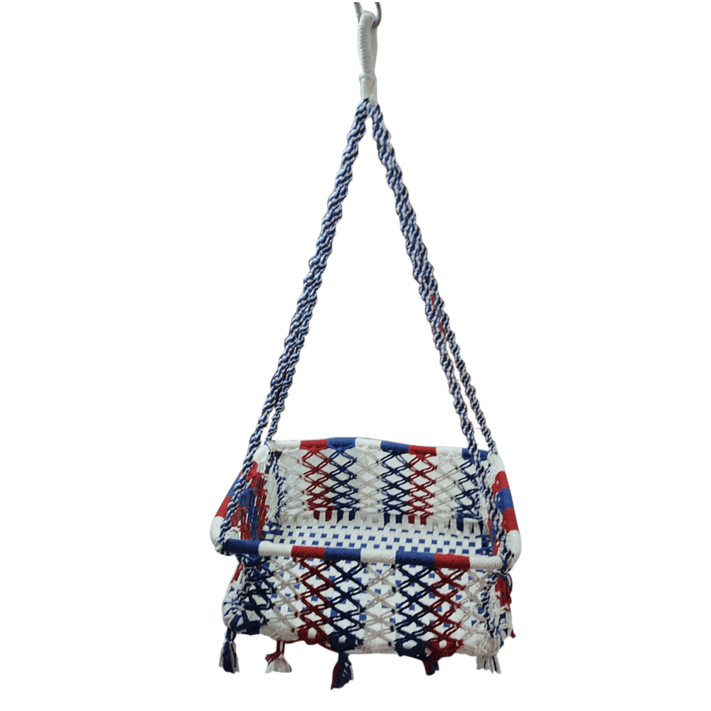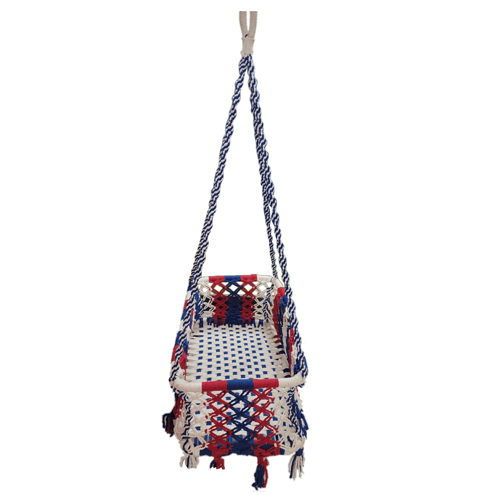Provide a safe and comforting space for your little one with this charming handwoven tri-color baby cradle swing. Meticulously crafted into a sturdy, rectangular basket shape, this swing offers a secure and gentle rocking motion. The patriotic Red, White, and Blue design is visually appealing, making it an excellent addition to a nursery, child’s room, or covered patio. Made from durable rope, it’s designed for security and comfort.